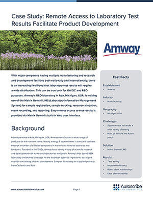 A new case study has been published by Autoscribe Informatics which highlights the use of the Matrix Gemini LIMS (Laboratory Information Management System) by Amway. Amway is a leading manufacturer of products for the nutrition, home, beauty, energy & sport markets. Matrix Gemini’s built-in web interface is providing its authorized users in a variety of locations with access to test results as soon as tests are completed. This single change potentially shaves weeks out of product development schedules, dramatically reducing the time it takes to develop new products and improving operational efficiency.